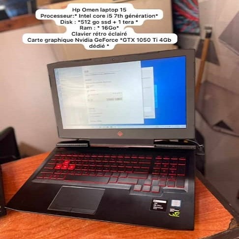 HP Omen laptop 15 Intel core I5 G7 512 GO SSD + 1 Tera RAM 16 Go Clavier rétro éclairé Carte graphique nvidia Geforce GTX 1050 Ti 4Gb dédié.